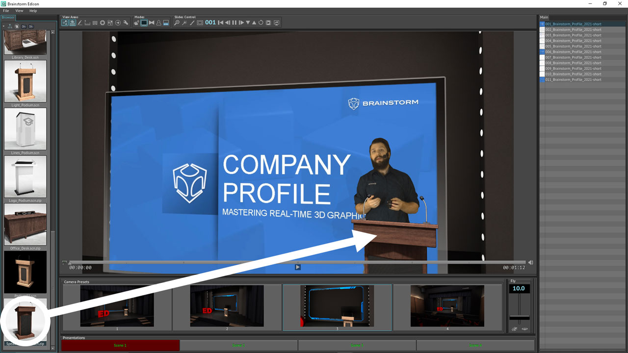 UE Visual 4KPro可以导入标准的PPT和PDF文件,主持人可以使用软件操作界面,来展示和控制幻灯片或页面。还可以使用点击器、智能手机或平板电脑来控制演示。软件自带虚拟屏幕并匹配幻灯片列表,可以通过拖拽加载各种内容,例如图片、视频、PPT、PDF、三维模型、互动模板、外来信号等。