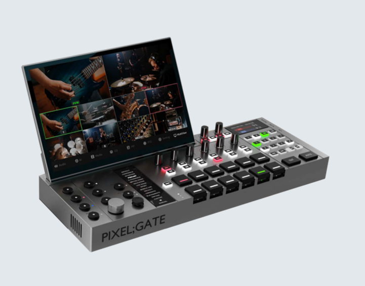 Pixel Gate 4K AI直播导播一体机采用全金属铝合金外壳, 一体机式模块化设计。导播台配备机械轴体按键,提供极佳 的触感反馈。导播一体机集成配置10.1英寸高清高亮触控屏幕,通过触屏即可完成导播台的操作应用。导播一体机 可应用于视频信号切换、网络直播、嘉宾连线、多通道录制、字幕叠加、LUT校色、AI智能识别、语音转写和会议 总结等,满足各类用户的全方位节目录制直播需求, 为新闻制作、校园活动直播、专家访谈、视频会议、大型会议 直播和课程录制等全场景应用提供一体化解决方案。