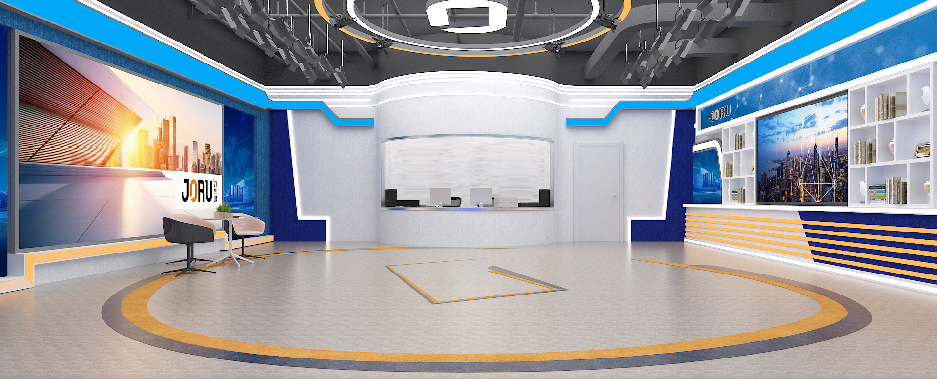 九州ku酷游演播室工程专业设计内容分为:实景演播区、虚拟演播区、控制室、录音室、