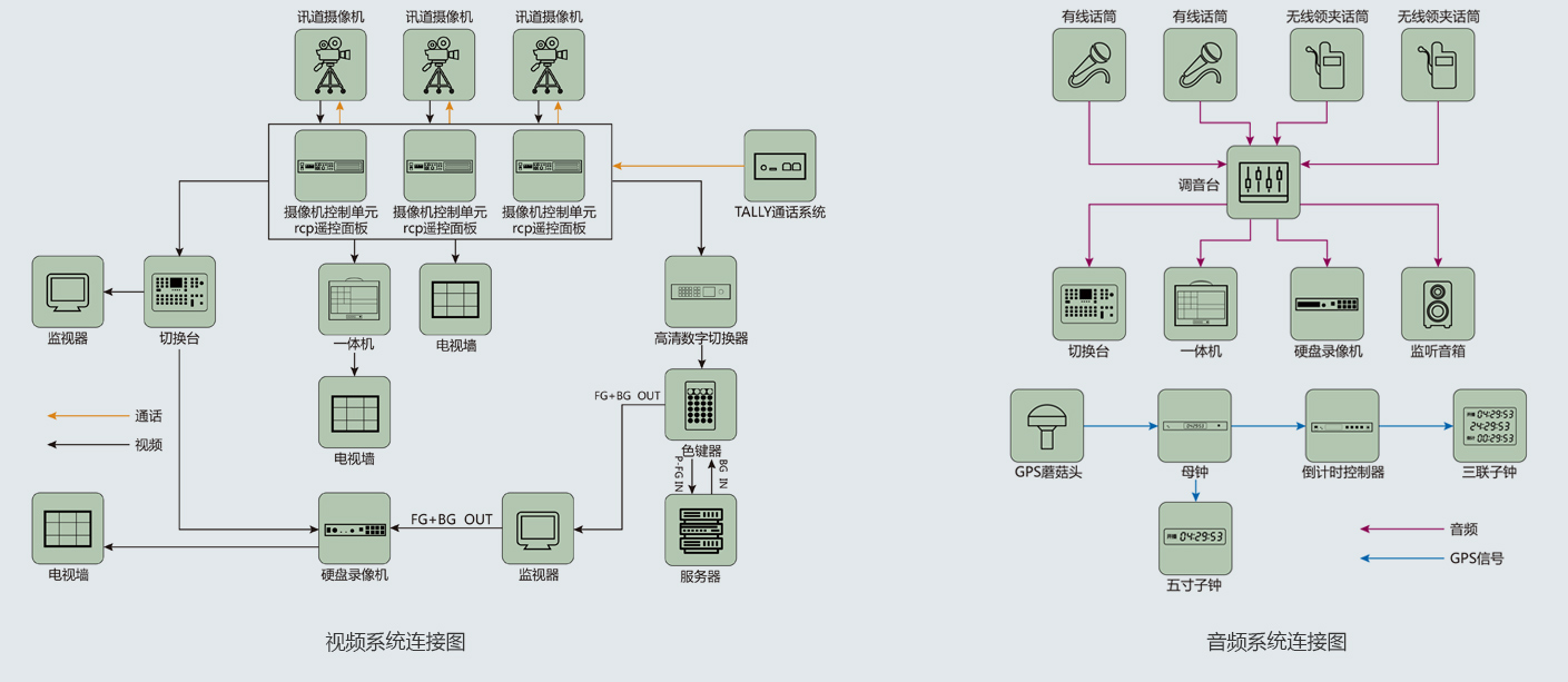 化妆间、演播室灯光、声学舞美、演播设备配套等几个方面。