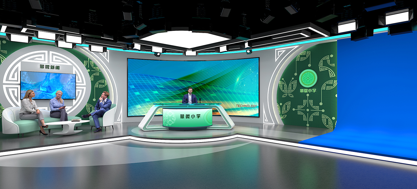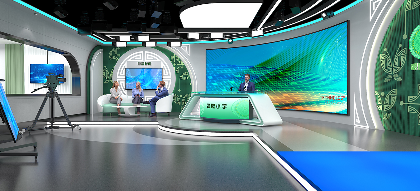 从前期的设计策划,到设备的提供、安装、调试以及整体的装修,九州ku酷游科技为北京翠微小学提供了全方位一体化的服务。该演播室分为实景播报区、虚拟演播区和导播区,用到的核心设备主要有虚拟演播室系统、非线性编辑系统、声学灯光系统及演播室舞美等。